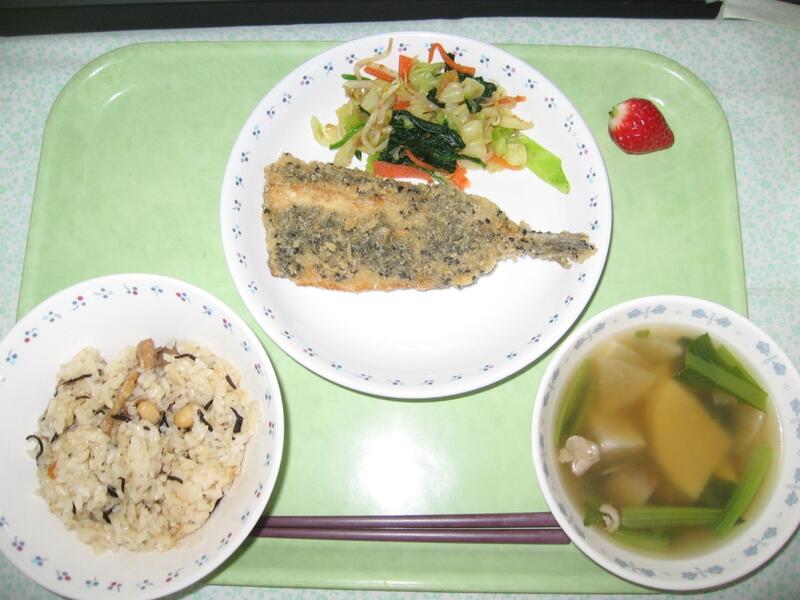 今日の主菜は鰆の野菜あんかけです。鰆は魚へんに春とかいて鰆と読みます。その名のとおり旬は春です。しかし、寒い今の時期は魚に脂が乗っていておいしいとされています。鰆にはエネルギーに変換するために必要なビタミンB2や脳を活性化させる働きのあるDHAやEPAも含まれています。今日はそんな鰆を片栗粉をつけてカラッと揚げて、その上に玉ねぎ、ピーマン、しいたけをケチャップ等で煮詰めてつくったあんをかけて食べます。鰆そのものは淡白な味なのですが、しっかりした味のあんをかけることでより美味しく食べられるかと思います。ぜひ味わって食べてくださいね。