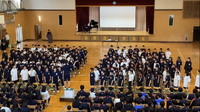 卒業式当日は1年生が自宅学習日となるため、今日が3学年全員で体育館に集まる最後の日です。全校で歌う、校歌や全校合唱は、卒業生への想いや学校への思いが込められた温かい歌声となり、学校全体で卒業を祝う気持ちが1つになる時間となりました。当日は2・3年生で行われますが、今日の歌声がきっと卒業生の心に残り、式本番や卒業後の未来に胸を張って過ごせるような力になることと思います。