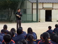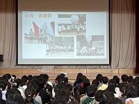 少し緊張した表情で体育館に集まった子どもたちは、中学校生活についての説明を真剣なまなざしで聞いていました。