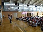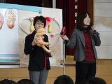 本校用務員,外谷さんの奥様です。とても楽しいお話をたくさんしていただきました。また,落語の歴史,めくりやお囃子,小道具などの説明もしてくださいました。