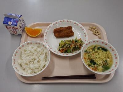 牛乳 ご飯 いかのかりん揚げ おかかあえ かきたま汁 清見オレンジ 炒り大豆