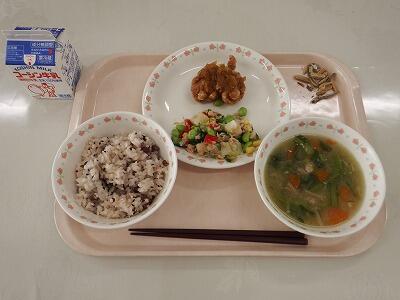 牛乳 お赤飯 ねぎだくジューシー唐揚げ なないろサラダ かぶのすり流し汁 アーモンド小魚