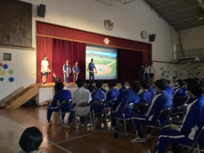 1,2年生は寸劇や歌で、3年生への感謝の気持ちを伝えました。