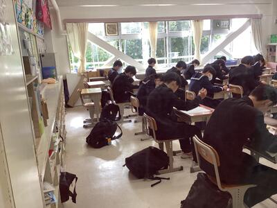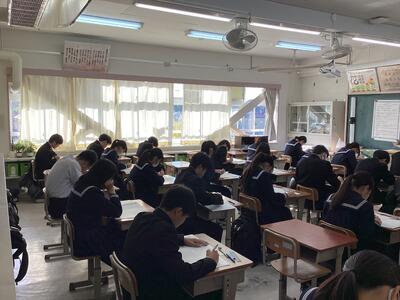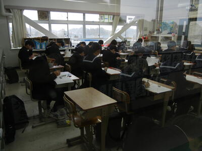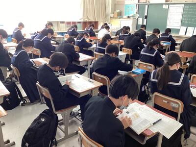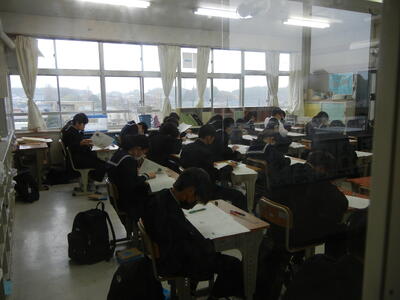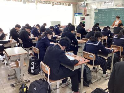 進路に関係するテストということもあり、いつも以上の取り組みが見られます。教室内には解答用紙に文字を記入する音だけが響きます。テストが終わっても気を抜くことなく、自分の進路に向けて頑張れ3年生!