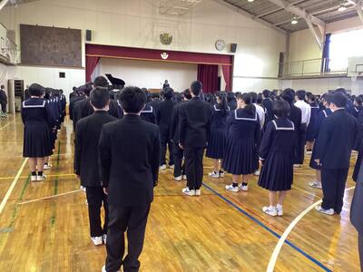 校歌斉唱の後、各学年代表、生徒会代表の生徒の話がありました。2学期の反省とそれをどのように3学期に活かしていくのか、3学期の目標などの話でした。
