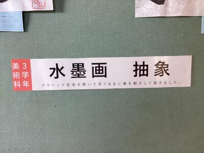 1年生の昇降口から2階への階段を上がると目に入ってくるのが、3年生が美術の授業で制作した水墨画です。この水墨画は、なんとクラシック音楽を聴いてそのイメージを水墨画にしたものなのです。