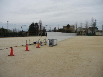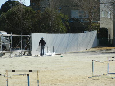 先週の金曜日から、長寿命化工事に伴う仮設校舎をグランドに建設するための囲いが設置され始めました。グランドの約半分を柵で囲っています。