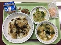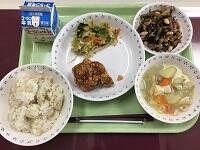 『ご飯・鶏肉の唐揚げ・おかか和え・大豆の磯煮・根菜のみそ汁・牛乳』