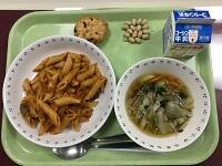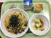 『和風スープスパゲッティー・マセドアンサラダ・手作り紅茶ケーキ・アーモンド小魚・牛乳』