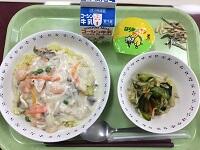 今日の給食は人気メニューの1つである『えびクリームライス』です。カレー粉とバターを入れて炊いたご飯に、えびがたっぷり入ったクリームソースをかけました。とても彩りが良い一品になりました。