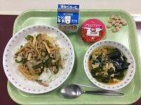 『青椒肉絲丼・卵とわかめのスープ・アセロラゼリー・きな粉大豆・牛乳』