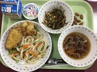今日は年に1度のメニュー「冷やしうどん」と「天ぷら」です。うどんとつゆは別々に配膳し、冷たいつゆに麺をつけながら食べました。うどんの麺にきゅうりとにんじんを混ぜたので、彩り良く仕上げることができました。