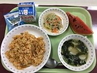 『焼きそば・中華五目スープ・フルーツ白玉・大豆小魚・牛乳』