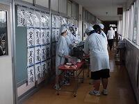 左上の写真は、毎日行う「検食」のために、宗形栄養士が本日の給食を運んできてくれた場面です。生徒が食べる30分以上前に校長が試食し、異物混入や味付け等をチェックします。 (文責 飯田)