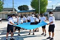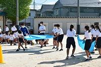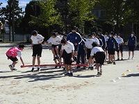 後半のスポーツの部は、コロナ禍ということで、ソーシャルディスタンスを意識した競技でした。ドッチボールに続いて行われた「布でボール運び」は、2メートル四方の布の四隅を4人で持ち、真ん中のボールが落ちないように運びます。「東海道五十三次」は、一輪車でボールを運んだり、タイヤに乗せた友達を引っ張ったりするリレーです。どちらも工夫を凝らしたクラス対抗種目でした。