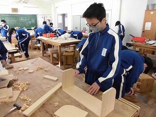 冒頭画像にあるのは、1年生の技術科で木材加工を行っている場面です。ノコギリやカンナ等の刃物を使っていますで、おしゃべりをしている余裕はないようで、皆真剣そのものでした。