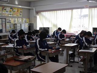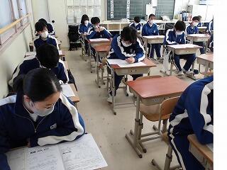 今日3年生の教室を見に行きましたが、公立入試直前ということで緊張感漂う中での授業でした。あるクラスはテストの予想問題に取り組み、あるクラスは学年末テスト返却の中で、「入試ではこんなことが問われるかも・・・」などの解説がなされているようでした。また女子体育はダンスのまとめ、男子は体力が衰えぬよう元気にサッカーをやっていました。いずれにしても最後の授業日などという感傷に浸っている場合ではなく、目指すべき所に向かってラストスパートをかけている状況です。