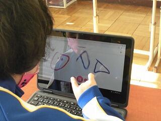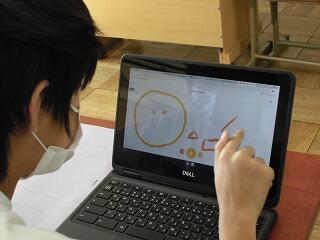 とても楽しそうに取り組んでいました。 タブレットなので指で操作できます。