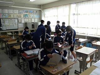 2年生は、「3年生を送る会の準備」に入りました。送る会でイメージするのは合唱のプレゼントですが、歌を歌うことが困難な状況になっています。このような中ですが、今できる最大限のことを考え、準備を始めているようです。どの学級をのぞいてみても生徒達が中心になって話し合いを進めています。さすが2年生だと思います。ものごとに主体的に取り組んでいく様子が見られ嬉しいです。「もうすぐ最上級生になる。」そんな心構えはもうすっかりできあがっているようです。