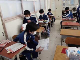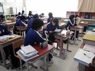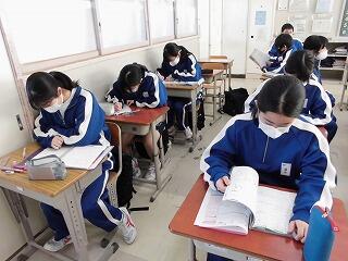 今日は今年度最後の定期テスト日、学年末テストの最終日です。1年生は入学したばかりのような印象がありますが、もう1年が終わろうとしています。はじめは緊張感が大きかった定期テストだと思いますが、すっかり慣れたことでしょう。1時間目前に教室に行ってみましたが、互いに教え合う姿、一人黙々と自学する生徒、集中力を高めようと?している生徒、様々な姿が見られました。