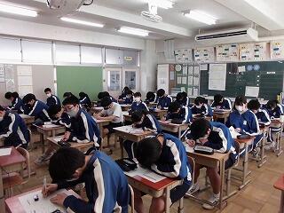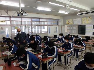 3年生の「進路集会」は、進路指導主任の学級が発信元となり、各教室のスクリーンにリアルタイムで配信し投影するという形で行われました。今までは体育館で学年生徒全員が一堂に会して行われていましたが、学級単位で話を聞く集会も、集中して話を聞いたり、わからないことをすぐに聞けたりするという意味では、メリットが大きいと思われます。いよいよ出願準備、公立の検査日まで1ヶ月を切りました。本当にラストスパートの時です。健康に十分に気をつけながら、悔いのないように準備して欲しいです。全員が納得いく結果を得られるよう応援します。(文責 飯田)