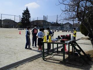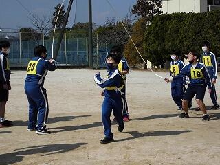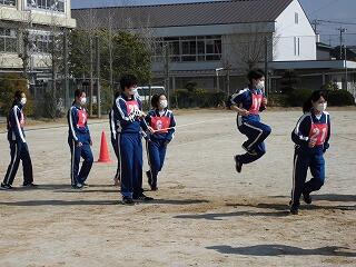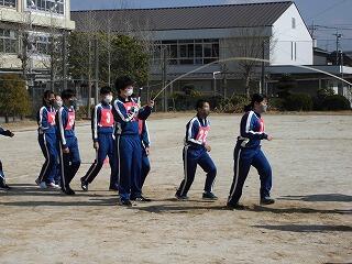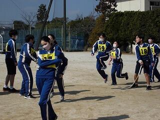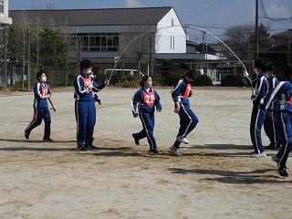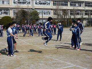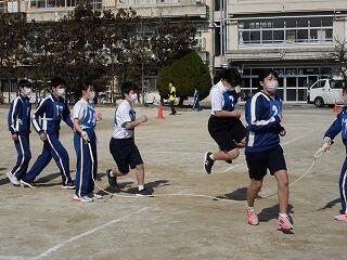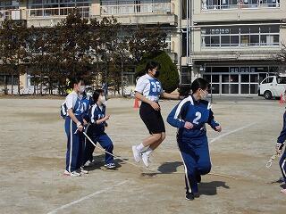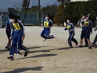 いわゆる「八の字跳び」と「大長縄(全員で一緒に跳ぶ奴です。)」の2種目です。運動不足なのか体力的に辛そうな生徒もみられますが、皆真剣そのもの。大長縄では何度も「せーの~」というかけ声でタイミングを合わせます。回し手は1秒も無駄にしまいと間髪入れずにかけ声を・・・、跳ぶ方は必死でついていきます。しかしながらとても温かな雰囲気で、終了時には、自然発生的に自分たちのチームへの拍手が起きていました。