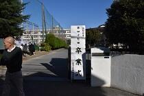 正門前の看板。その傍らに、お祝いのメッセージを掲示しました。