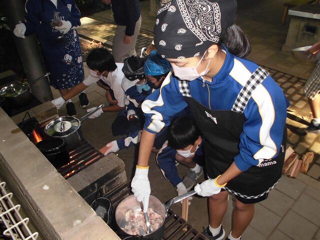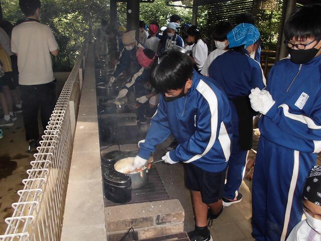 飯盒炊爨はなかなか大変です。包丁で食材を切るのに難渋する生徒、米のとぎ方がわからない生徒、かまどの火はなかなか点けられません。煙で目が沁みて泣きながら鍋を扱う生徒等、大変有意義な活動ができたと思います。