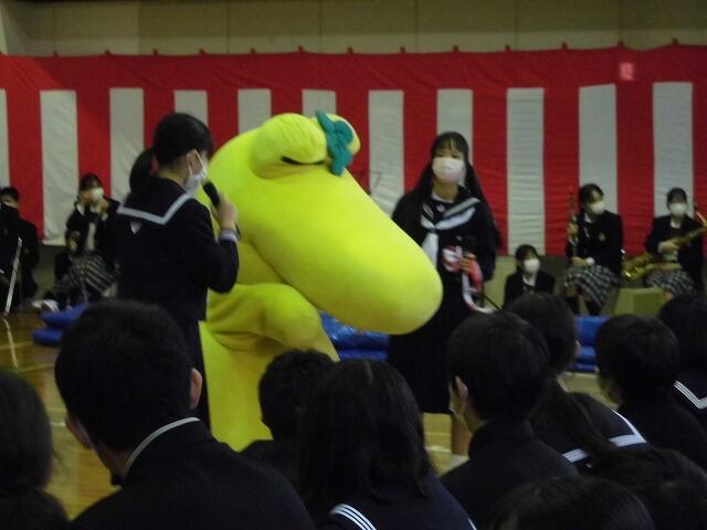 式典2部では、「四中の歴史」を生徒会の皆さんがスライドで発表してくれました。創立間もない頃の校舎や、行事、ジャージ、体操服の違い等、大変興味深く見ることができました。サプライズ登場したカシワニ君との会話もとても上手でした。