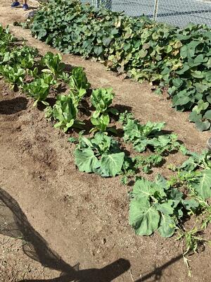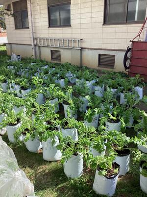そんな中、青々とした葉をつけているのが、3年生が技術の授業で栽培している大根です。体育館と武道場の間にきれいに並べられています。収穫は12月だそうです。3年生の保護者の皆様は楽しみにしてお待ちください。