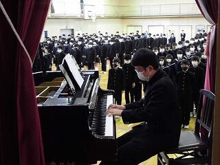 立派な態度で始業式に臨む2,3年生 校歌はまだ歌えません。ピアノで演奏してくれました。