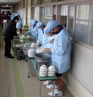 給食の配膳待ちです。 1年生は密を避けるため廊下で配膳しています。
