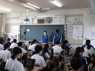 各クラスでは、今日からの3日間で、総会資料の読み合わせや学級討議を行い当日の準備を進めていきます。上記画像は、初めて生徒総会に臨む1年生の学級を訪れ支援している生徒会本部の先輩達です。1年生達は、先輩達の指示を聞きながらタブレットのページをめくり資料の確認をしていました。