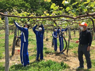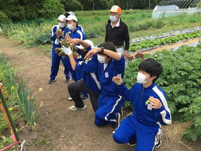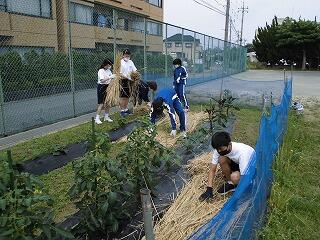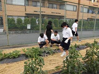 本年度あじさい学級では、技術家庭科で「菜園」を始めました。菜園作り(農業)は教頭先生の専門です。畝にわらを敷く効果や作業手順等について的確な指示を出していました。皆、手際よく、楽しそうにわら敷きをしており、「楽しい~!」との声も聞こえてきます。すでに実を付け始めている野菜もあり、収穫が今から待ち遠しいです。鳥などの野生動物も、実をついばみに来るのではないかと心配する声も少し聞かれました。(文責 飯田)