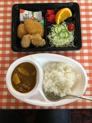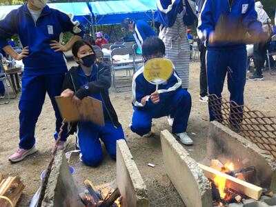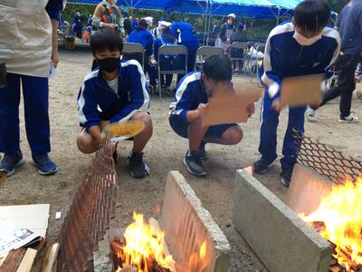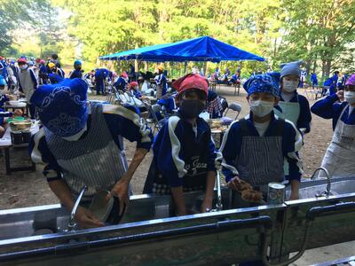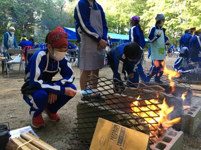 飯盒炊さん。ご飯を焦がしている班もありましたが、何とか食にはありつけたようです。作ったのはカレーとご飯です。画像にある、それ以外のおかずは支給されてます。