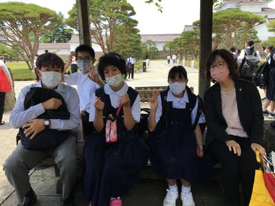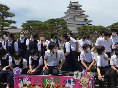 好天ですがやや暑いです。ジェラートを美味しそうに食べている生徒達もいます。この後、鶴ヶ城で集合写真を撮り、昼食後帰路に着きます。