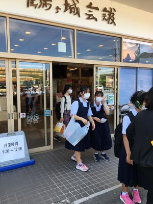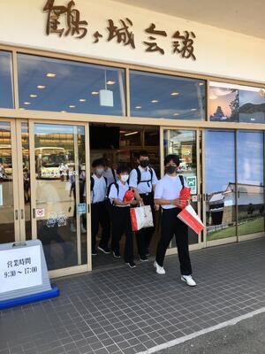 ホテル前で閉校式を行い、会津若松市内での班別行動が行われています。朝、やや体調が悪かった生徒は、朝食後回復し、一緒に行動しています。
