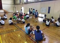 女子体育は球技(バスケットボール)の総まとめとして、リーグ戦が行われていました。班で作戦を考えたり、活動の反省を行いながら取り組んでいました。写真はゲーム後のチームの反省(振り返り)を行っている場面です。