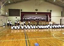 本日6校時、学活の時間に1年生は体育館において、合唱コンクールに向けたリハーサルの第1弾として、学年や学級の合唱隊形、ステージへの移動などの確認が行われました。当日の発表に向けて、よりよい形で臨めるよう準備していきます。