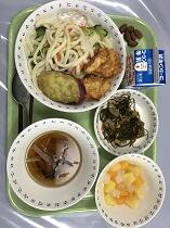 今日は、夏を感じさせる献立の1つ「冷やしうどん」「天ぷら(鶏肉・さつまいも)」でした。年に1度のメニューということもあり、午前中から給食を楽しみにしている生徒を多く見かけました。