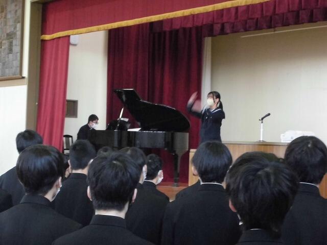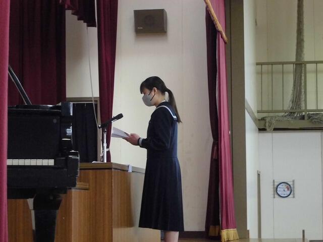 元生徒会長による答辞です。 保護者の方を向いて歌います。