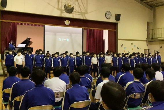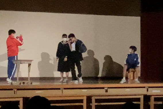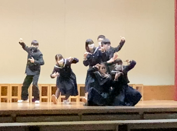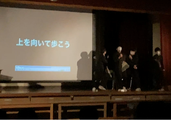 1年生は、キレキレのダンス、ルービックキューブ、けん玉等の個人技を大写しにする撮影技術を駆使しての発表に続き、寸劇、ラップ、最後は学年全員による合唱を手拍子等を交えながら行い、感動を呼びました。