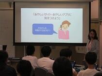 今回は、パソコンの画面を見たり、また操作したりしながら、アプリやサイトの危険性など、実際に携帯電話やスマートフォンを利用している生徒にとってはとても身近な話題を取り上げ、授業を行っていただきました。