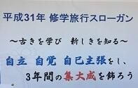 新年度、5月8~10日に実施予定の京都・奈良方面の修学旅行スローガンは「自立 自覚 自己主張をし、3年間の集大成を飾ろう! ~古きを学び 新しきを知る~」に決まりました。生徒たちは生活、学習、コース、保健・食事・美化の4部会に分かれ、目標やルール決め、仕事内容等の確認など修学旅行当日に向けて準備が進められています。