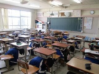 落下物から身を守るため机の下に避難する生徒           落ち着いて昇降口から避難する様子