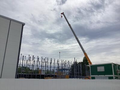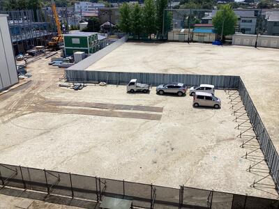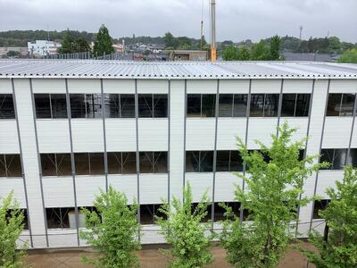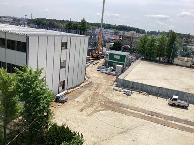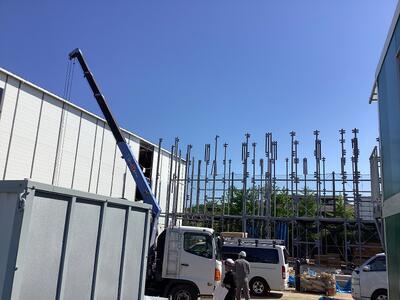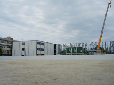 本校舎正面の仮設校舎は屋根も付き、外観もほぼ完成しました。現在は正門側に支柱がたち始めています。