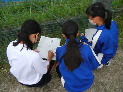 午後の授業時間、1年生がファイル片手にグランドに出ていくので後を追ってみると、グランドの片隅で何やら地面を見ながらメモをしています。担当の先生に聞いてみると「春の野草の観察です。」との答えでした。「春???」一瞬、「夏」の間違えかとも思いましたが、担当の先生曰く「観察授業の予定日が雨の日ばかりで今日になりました。」とのことでした。「春」は見つかったのでしょうか。