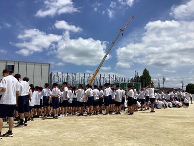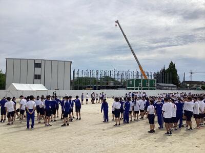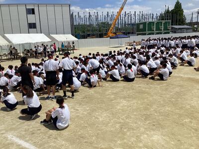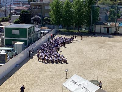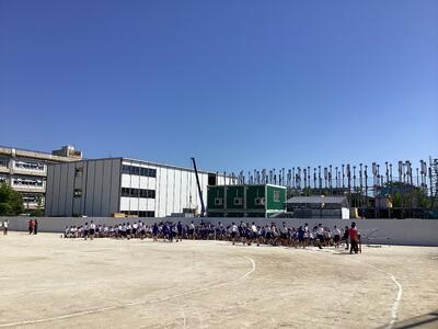 今日から来週の体育祭本番に向けての練習が始まりました。長寿命化工事に伴う仮設校舎建設の関係で、グランドが例年の半分しか使用できませんが、応援席配置など工夫をしながら実施します。
