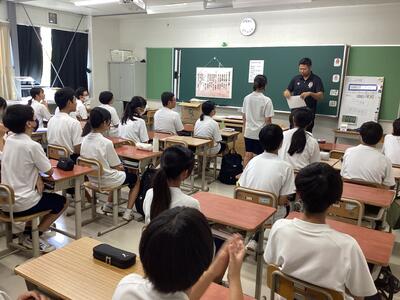 校歌斉唱後、校長先生からは「2学期も主体的な活動を心がけるように」との話がありました。また、夏休み中の部活動やコンクールの表彰がありました。生徒指導主任からは「仮設校舎での生活、友達への声掛け」などの話がありました。