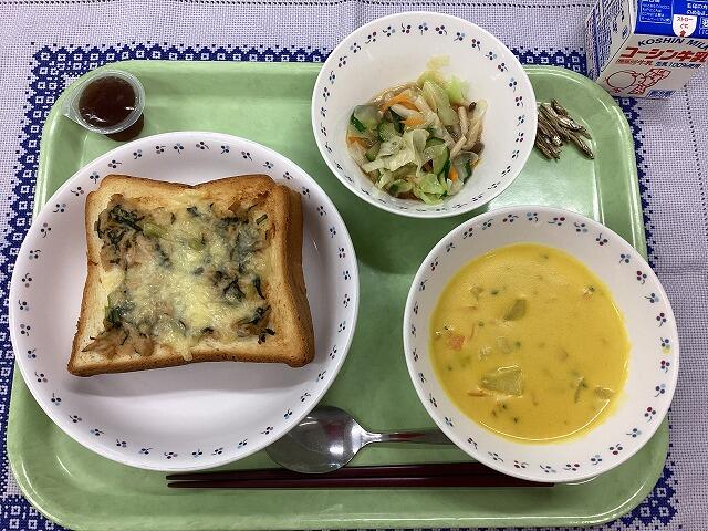 一覧へ ツナチーズトースト 日時 2025年09月04日(木) 公開対象 給食室 詳細 ツナチーズトースト きのこサラダ かぼちゃのクリームスープ ひと口ゼリー(ぶどう味) 小魚 牛乳 ★今日のトーストは、ツナ・チーズ・小松菜(千葉県産)をのせて、こんがり香ばしく 焼き上げました。いつもよりも厚切りのトーストなので、中はふっくら、外はカリっと しています。 作成者 柏第四中学校管理者 更新日時 2025-09-04 12:23:59
